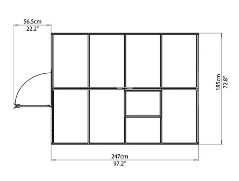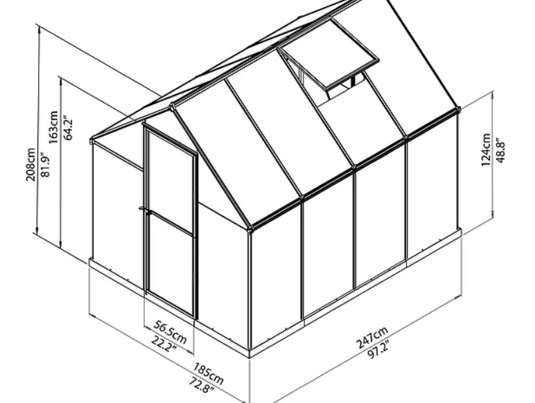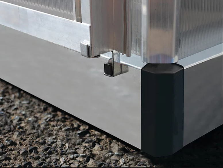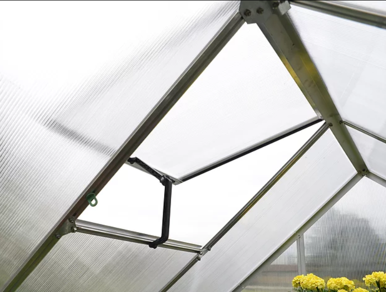 • מסגרת החממה מאלומיניום וזיגוג משולב כוללת מרזב וראשי ניקוז.