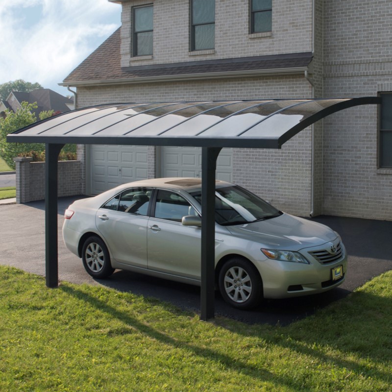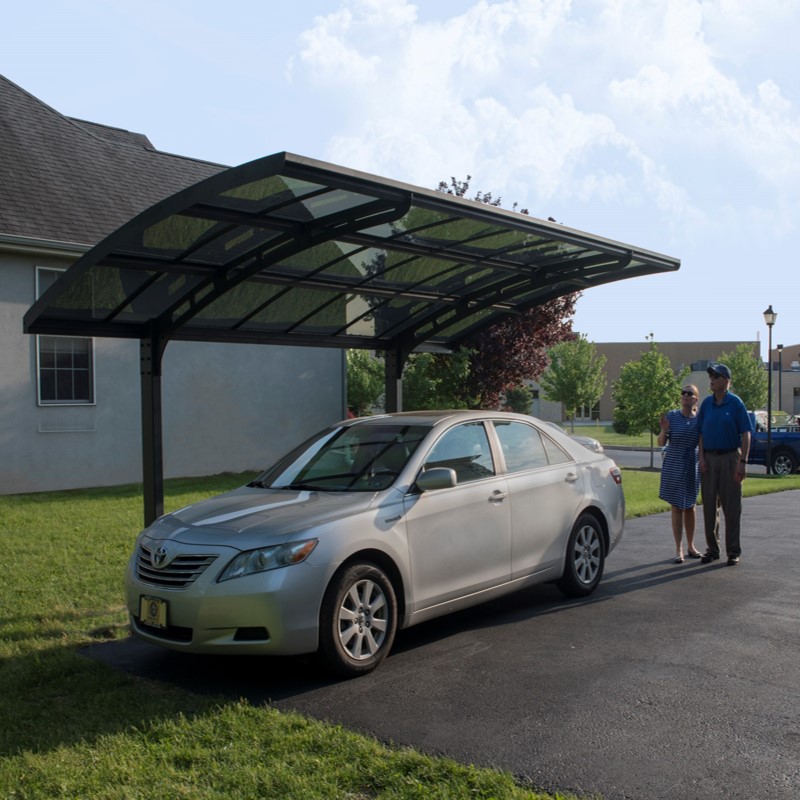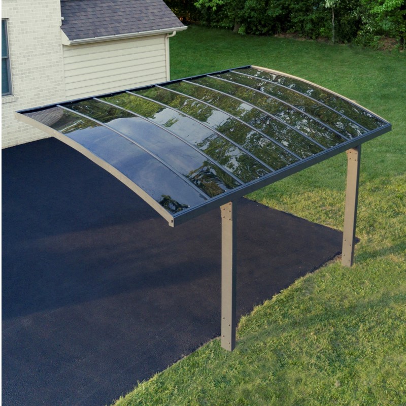 החניה מורכבת משלד אלומיניום חזק במיוחד, קירוי העשוי מלוח פוליקרבונט שטוח, מוגן UV בגוון ברונזה.