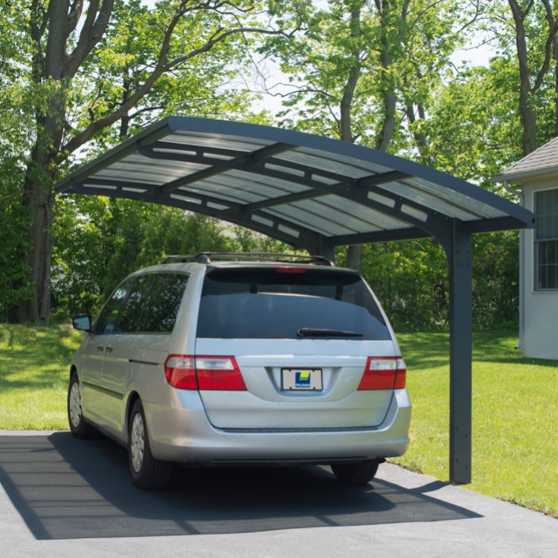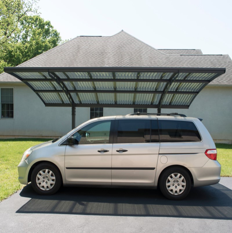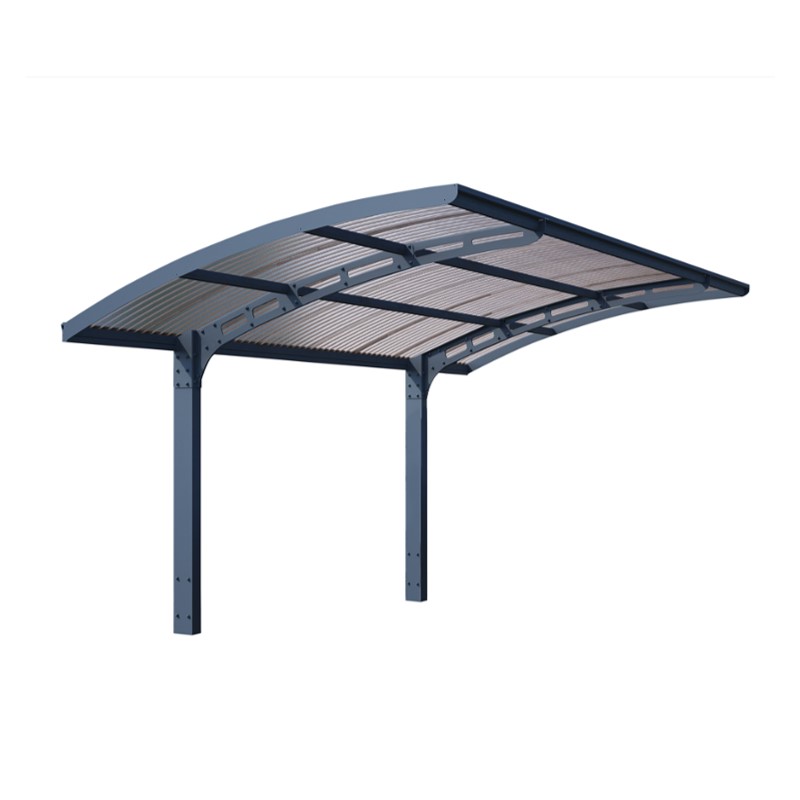 החניה מורכבת משלד אלומיניום חזק במיוחד, קירוי העשוי מלוח פוליקרבונט גלי, מוגן UV בגוון אפרפר.