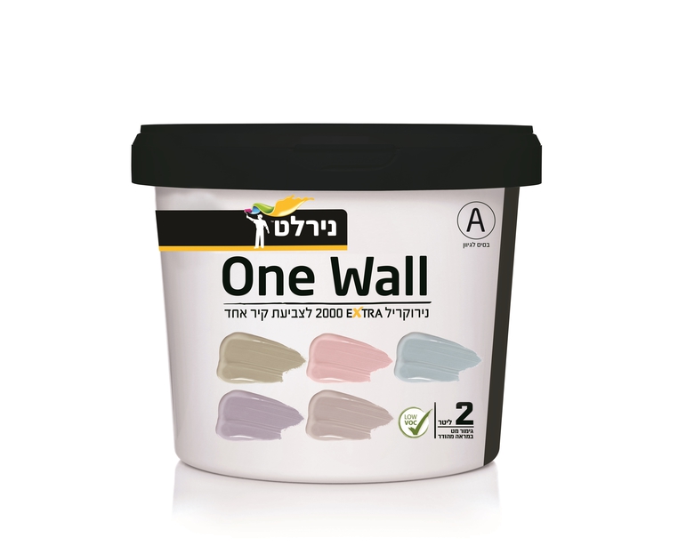 ONE WALL מכיל 2 ליטר צבע אקרילי בגימור מט – מהודר, מגיע בשלוש אריזות המציינות קבוצות גוונים שונות: קבוצת גוונים נועזים, גווני ביניים וגוונים בהירים ורגועים.